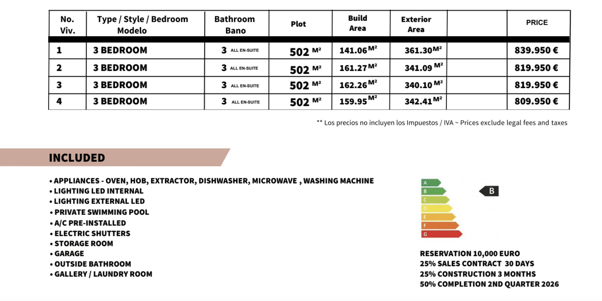 Situated on spacious 500 m² plots, each villa offers three en-suite bedrooms, large terraces, and a generous private pool.