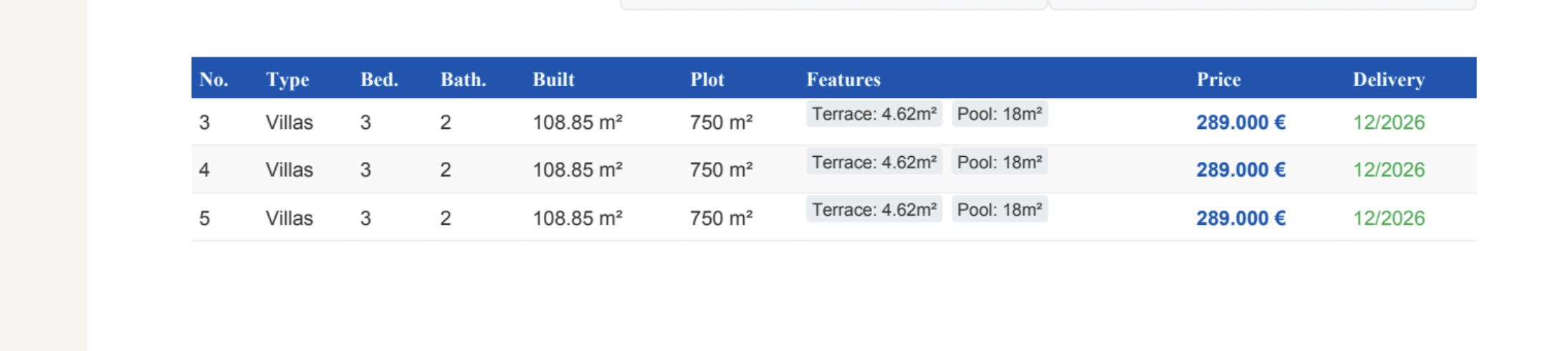 | Villa | 3 | 2 | 108,85 m² | 4,62 m² | 750 m² | 289,000€ | More info... |
