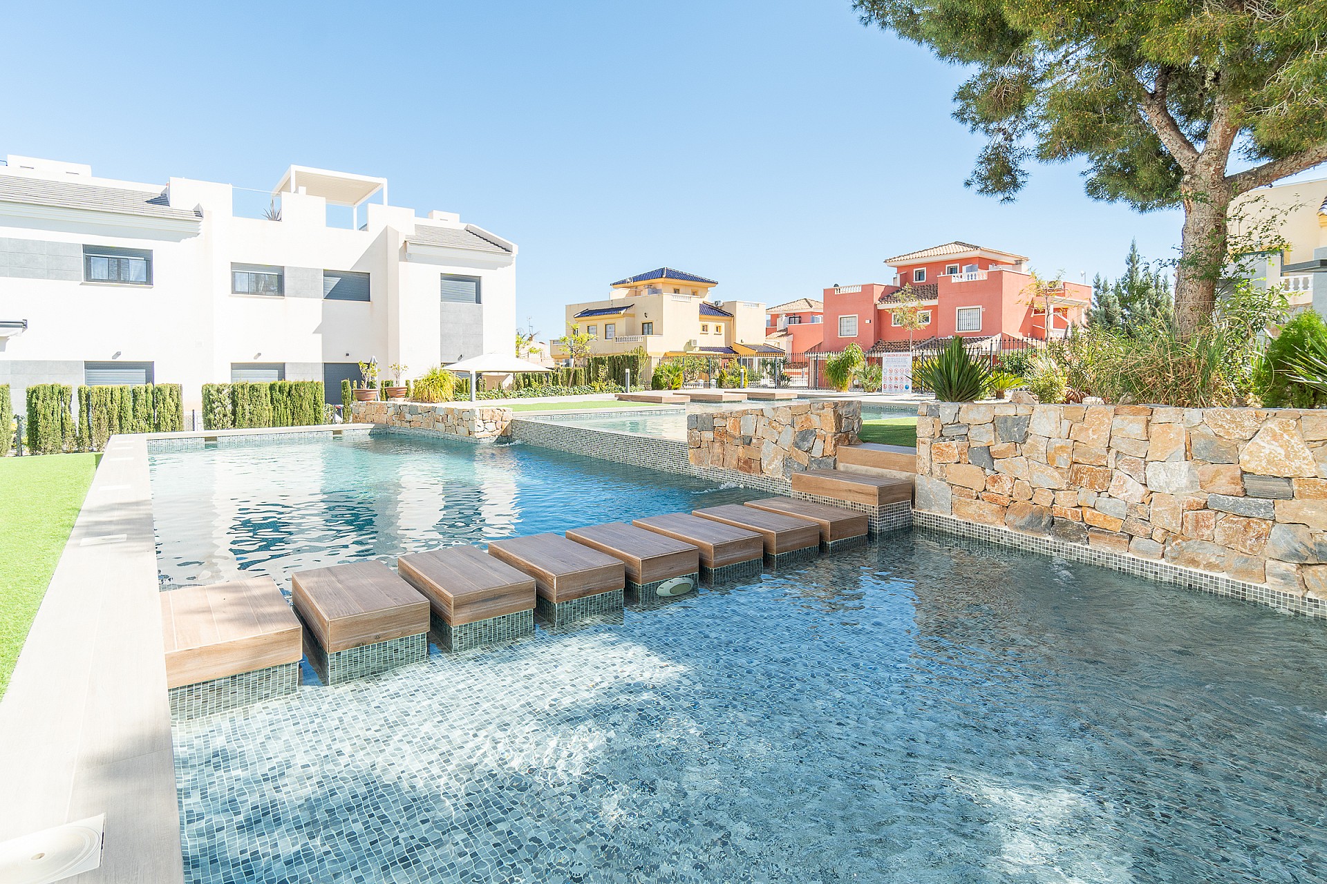 Homes including outdoor lighting, white goods* (except washing machine), electric shutters, fitted wardrobes, finished bathrooms with underfloor heating. The upper floors have pre-installation for an outdoor kitchen. Internet, alarm and home insurance for 1 year are included.