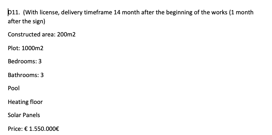 | Villa | 3 | 3 | 200 m² | 1000 m² | 1,550,000€ | More info... |