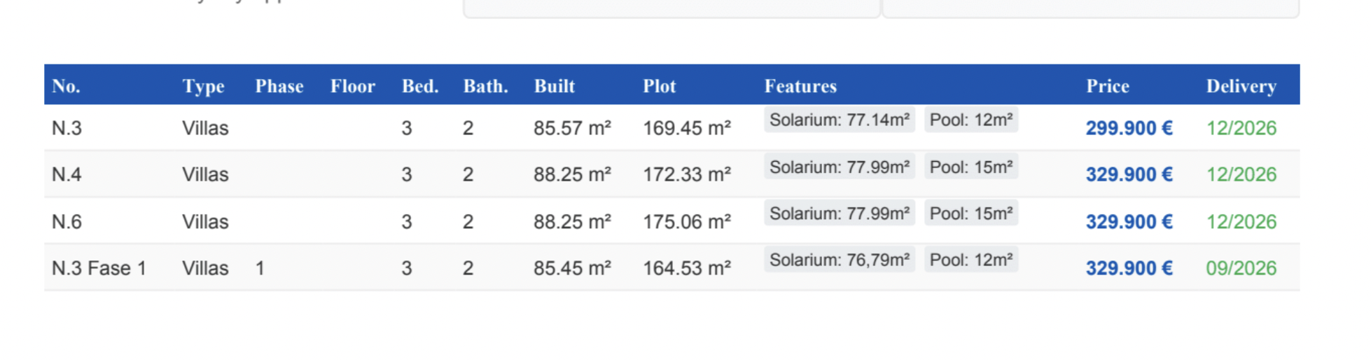 | Villa | 3 | 2 | 85 m² | 77 m² | 170 m² | 299,900€ | More info... |