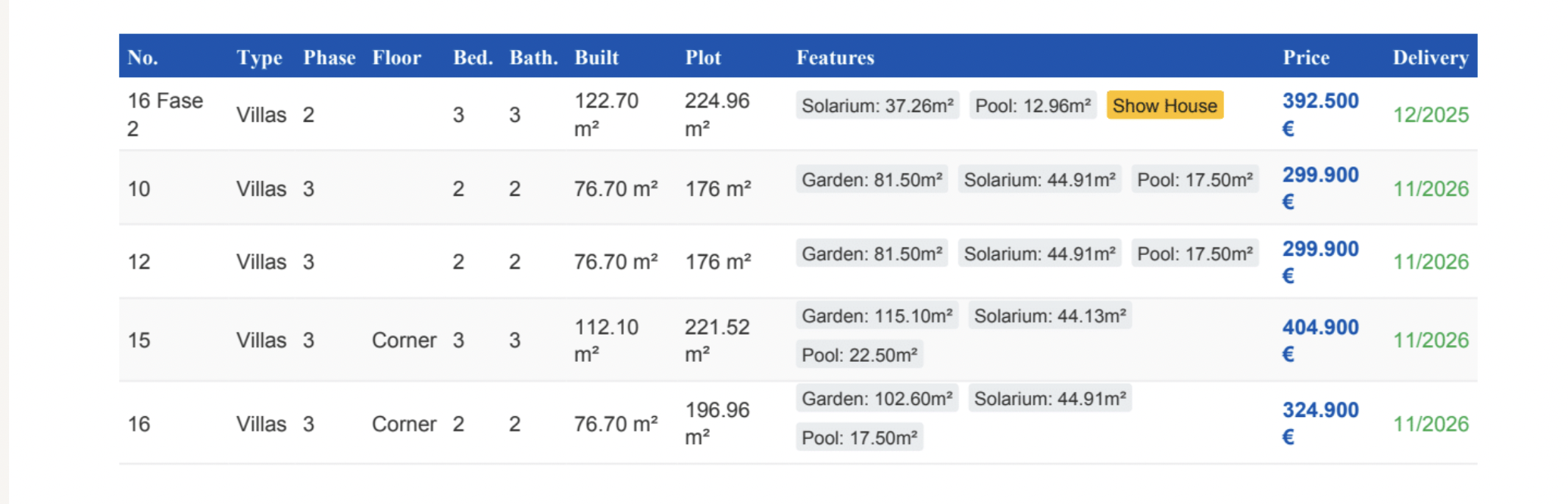 | Villa | 2 | 2 | 76 m² | 45 m² | 176 m² | 299,900€ | More info... |
