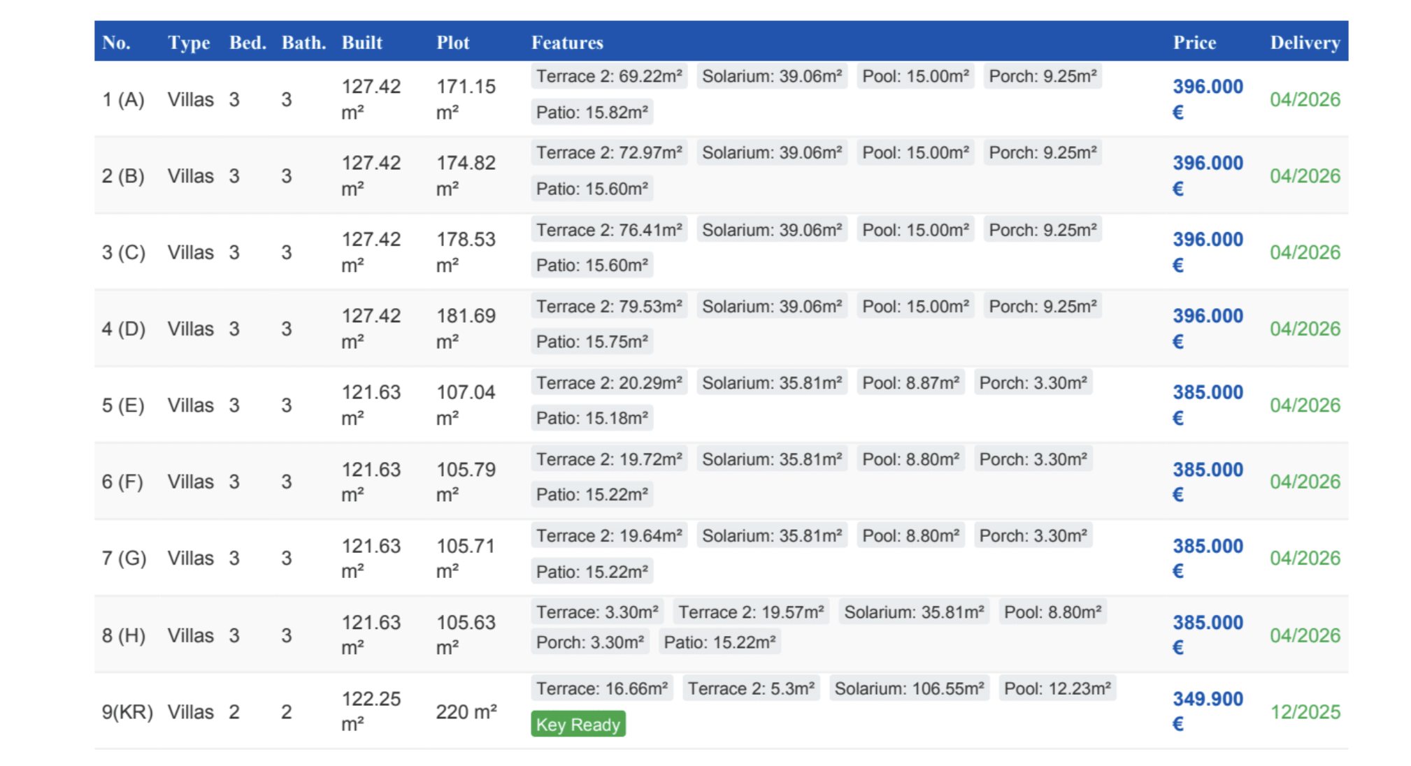 | Terraced villa | 2 | 2 | 122 m² | 106 m² | 220 m² | 349,900€ | More info... |