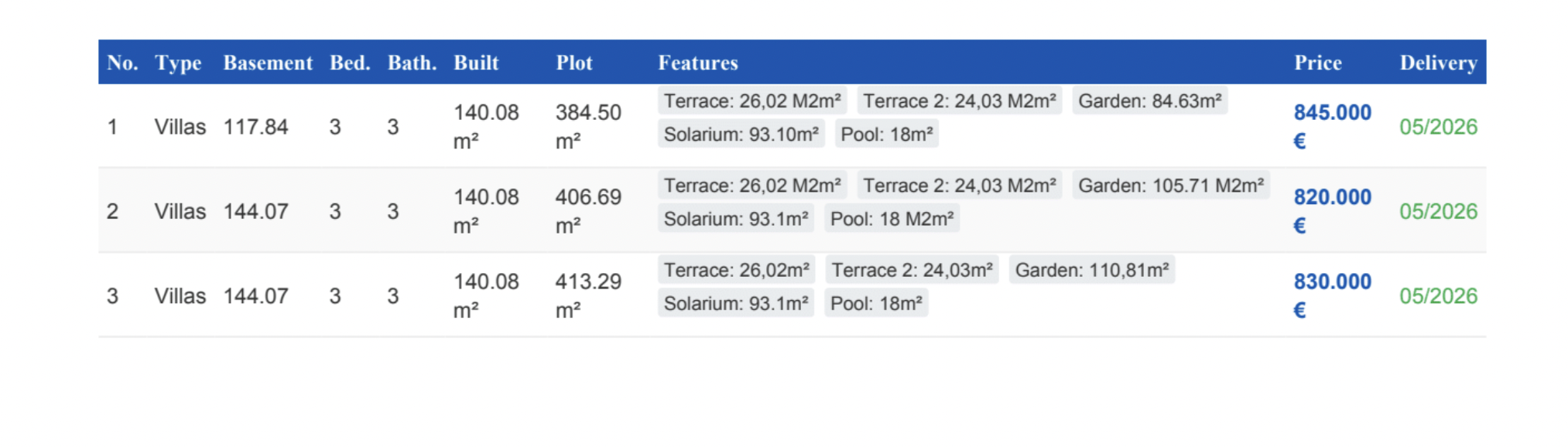| Villa | 3 | 3 | 140 m² | 50 m² | 93 m² | 105 m² | 406 m² | 820,000€ | More info... |