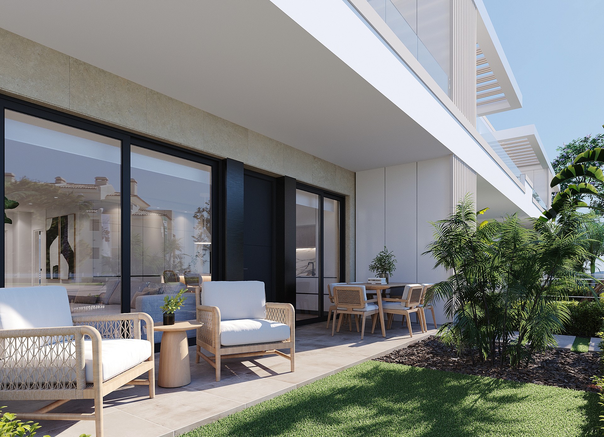 This new phase includes two- and three-bedroom apartments: ground floor with gardens, first and second floors with large terraces, and penthouses with solariums, as well as bungalows with gardens on the ground floor and solariums on the upper floor.