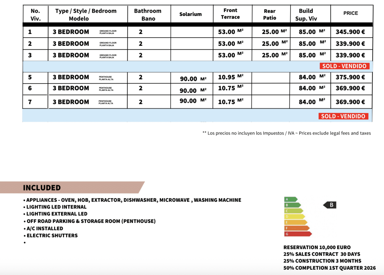 All homes have air conditioning, a fully equipped kitchen with BOSCH appliances and electric shutters. In addition, the bathrooms are fully finished and equipped with underfloor heating. The complex offers a beautifully landscaped communal area with a swimming pool for relaxation and cooling.