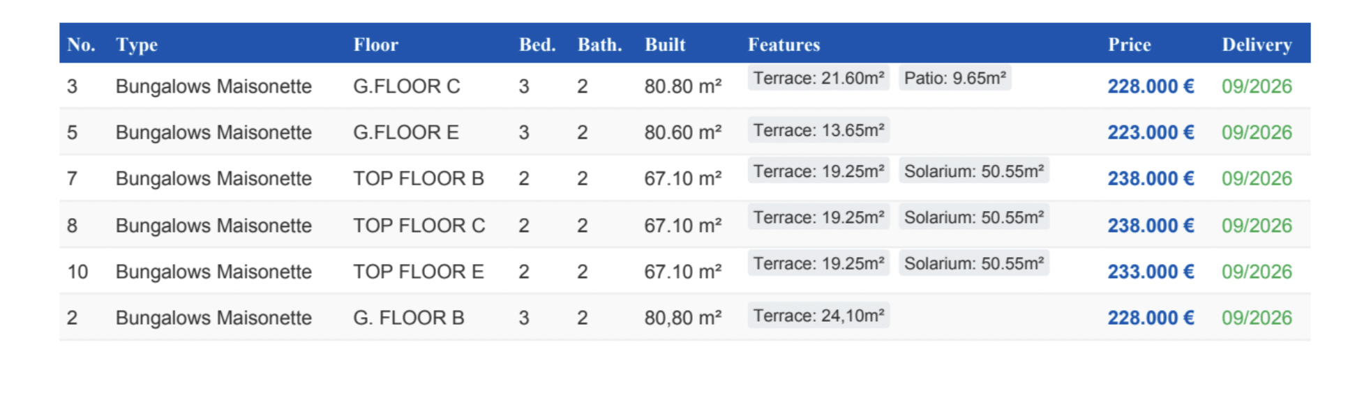 | Model | Bedrooms | Bathrooms | House area | Terraces area | Solarium area | Min price | |