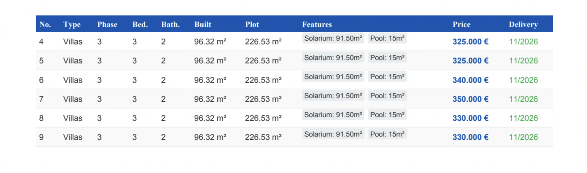 | Terraced villa | 3 | 2 | 96 m² | 91 m² | 226 m² | 325,000€ | More info... |