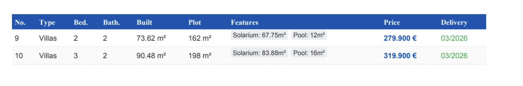 | Villa | 2 | 2 | 73 m² | 67 m² | 162 m² | 279,900€ | More info... |