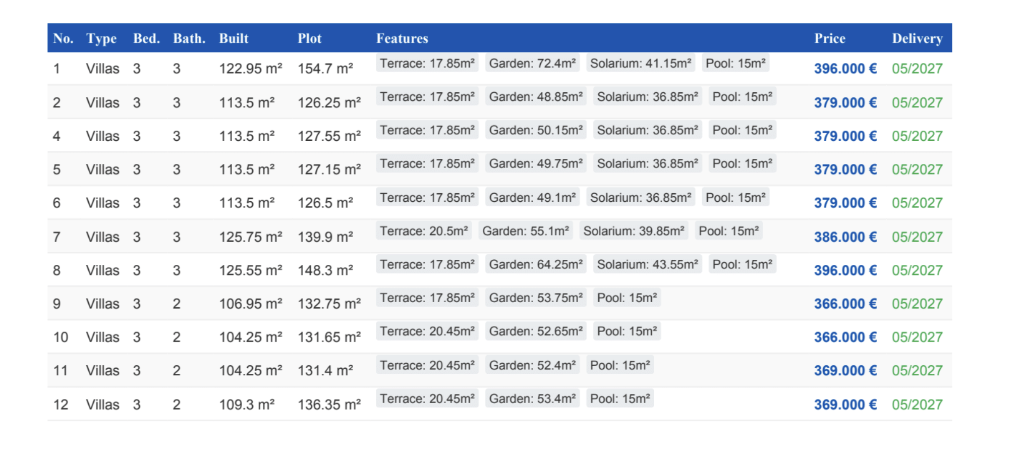 This project consists of 12 modern villas with 3 bedrooms and 2 or 3 bathrooms, each with its own private pool, terrace and in some homes a solarium with a summer kitchen. Two of the villas are also equipped with solar panels for extra energy savings.