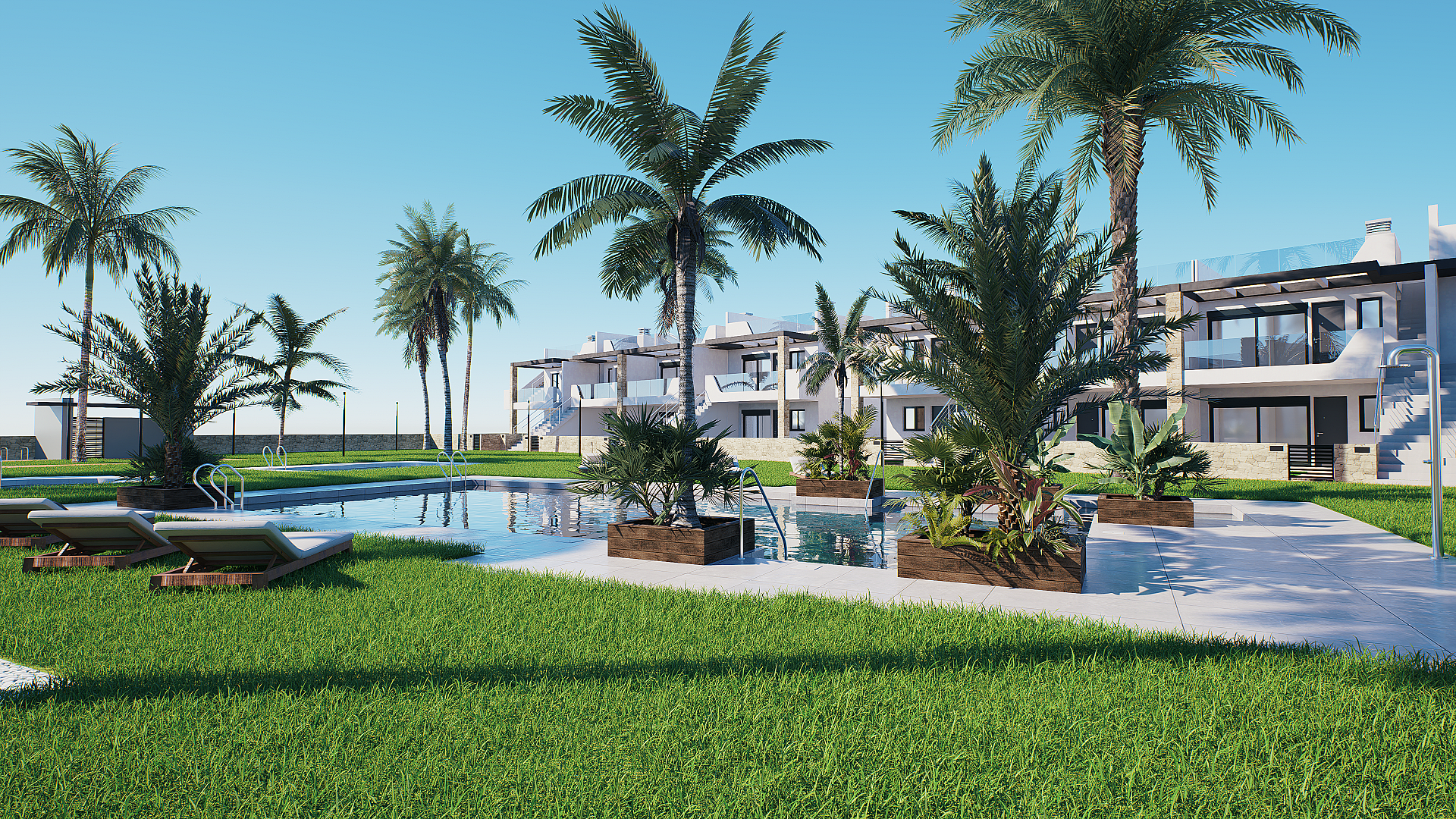 Thiar Village IV - Apartment with garden provided with 2 Bedrooms and 2 Bathrooms, communal swimming pool and underground parking space, located in Pilar de la Horadada at the Costa Blanca South in Spain.