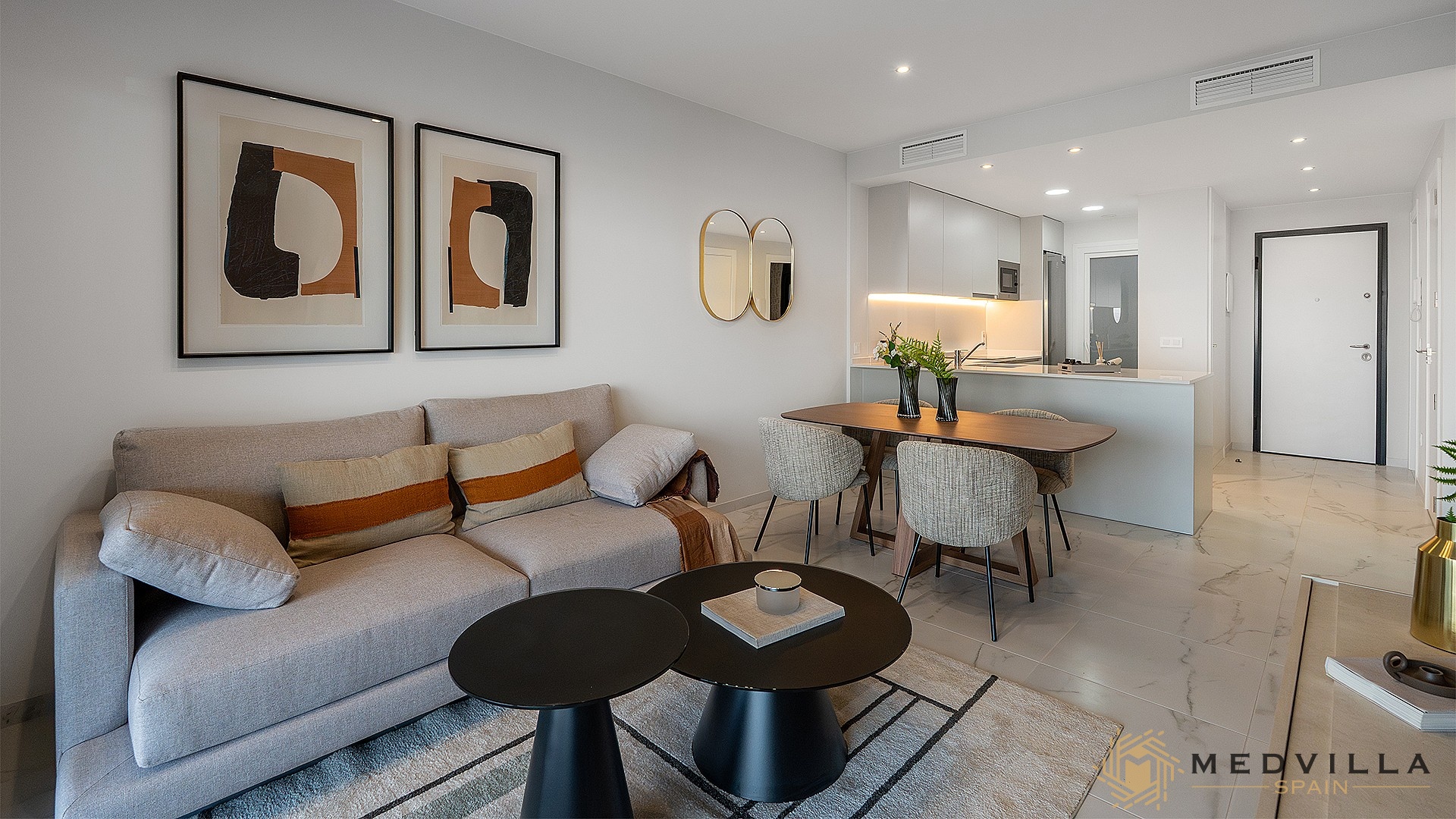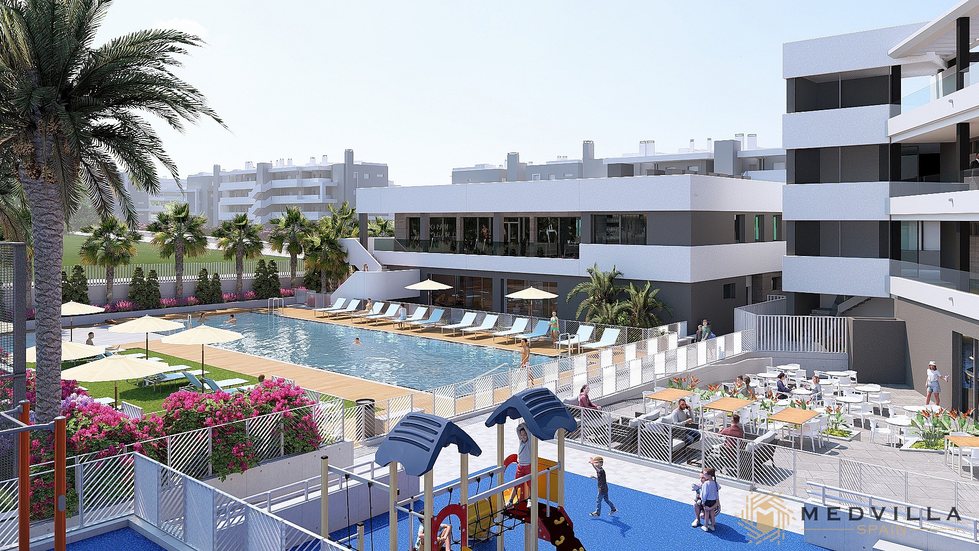 Lagoons Village - Key ready Apartment with terrace provided with 2 Bedrooms and 2 Bathrooms, communal swimming pool and underground parking space, located in Torrevieja at the Costa Blanca South in Spain.