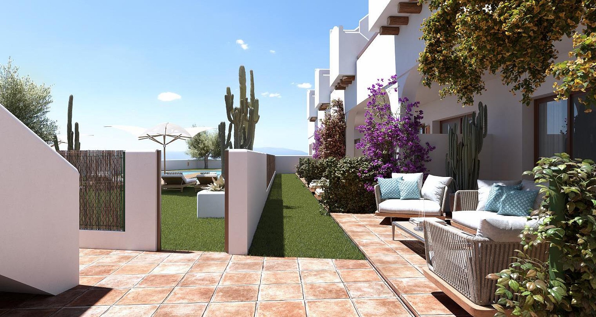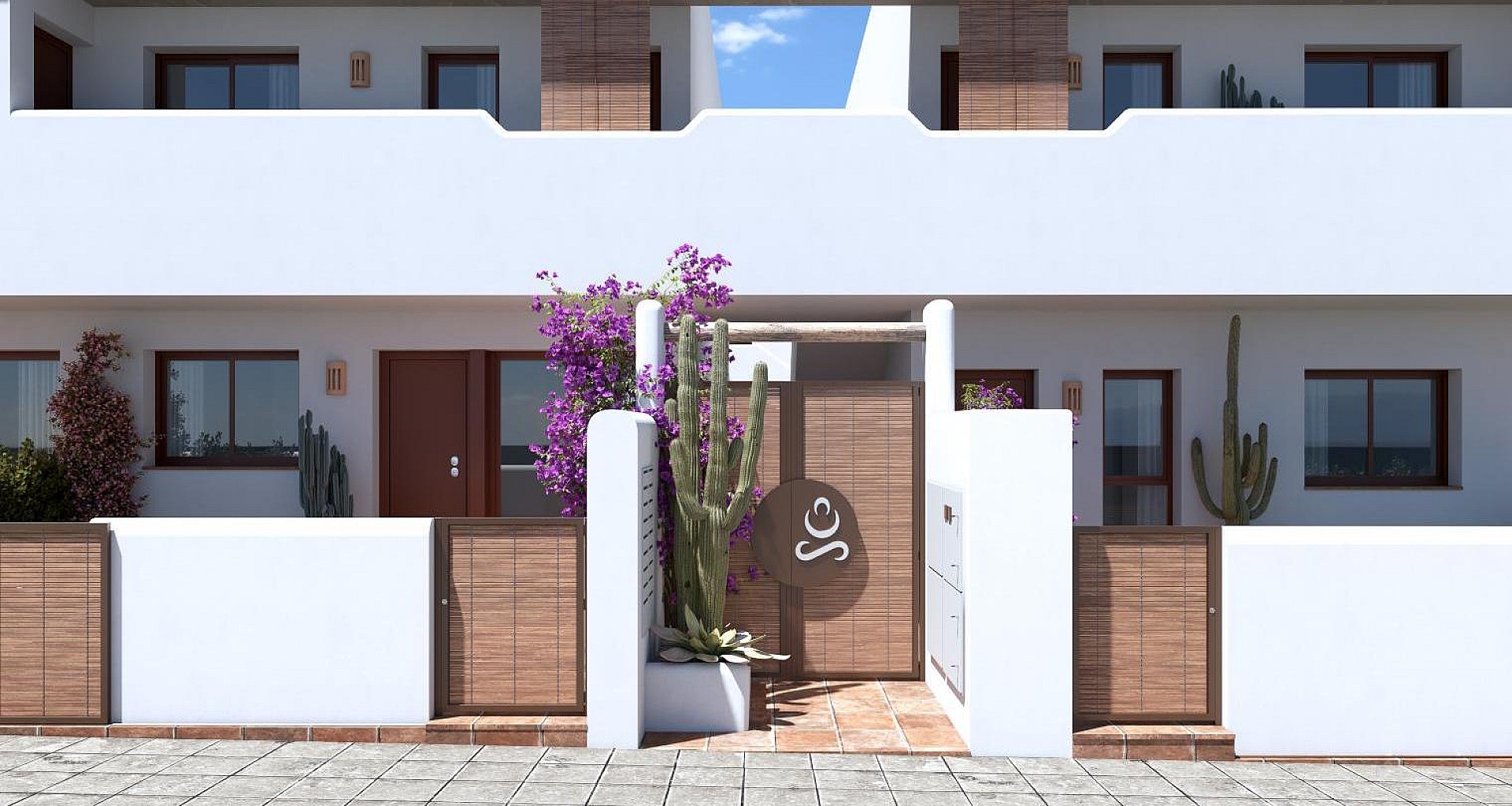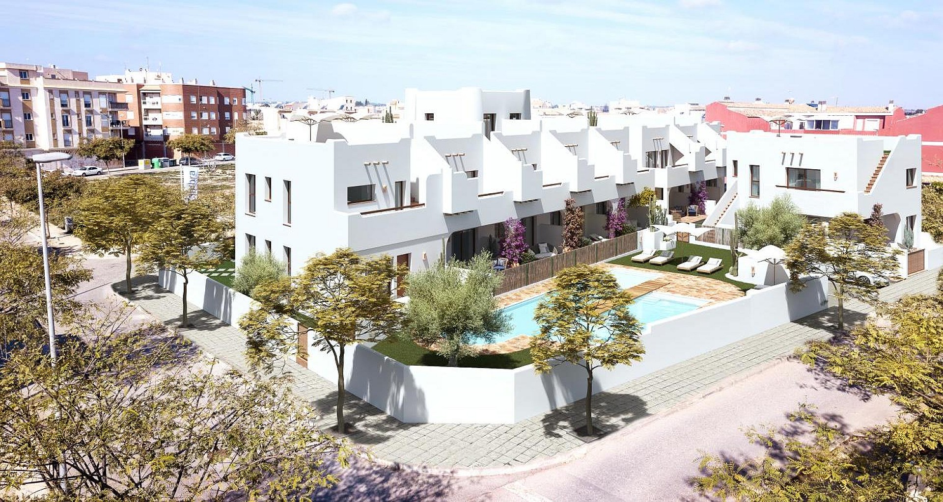 Small-scale complex with 16 bungalows and a corner duplex. The communal area offers a swimming pool and green areas, perfectly oriented to the southeast for maximum hours of sunshine.