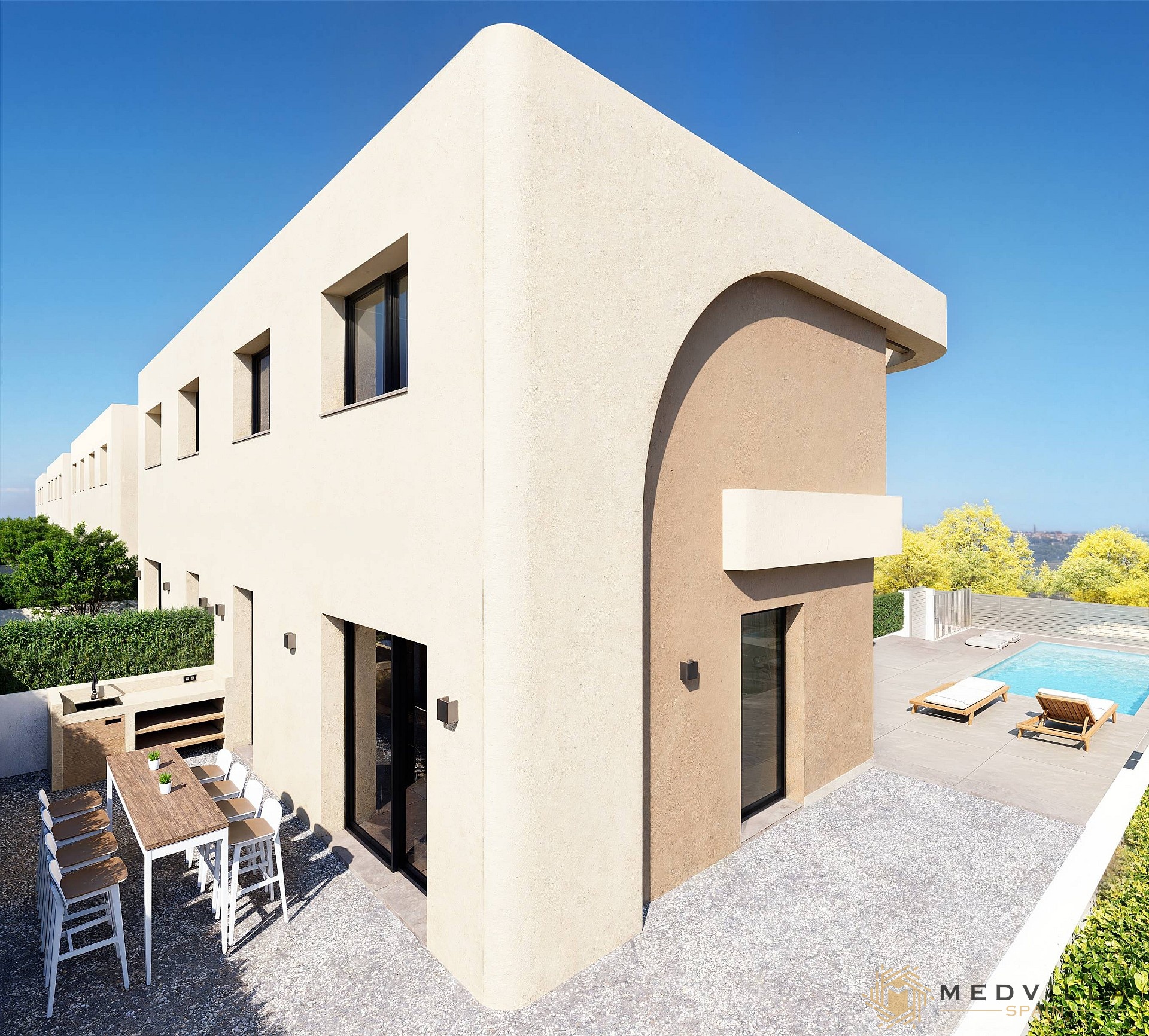 The price includes the following extras as standard: pre-air conditioning, finished kitchen, finished bathroom(s), electric shutters in bedrooms, etc…