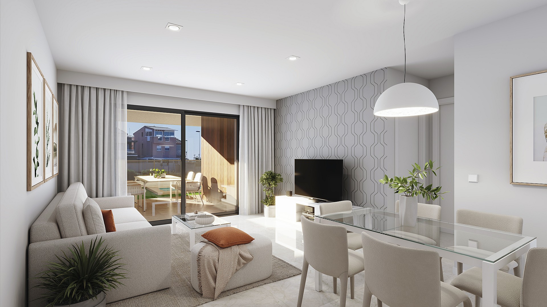 Perla Playa 3 - Apartment with garden provided with 3 Bedrooms and 2 Bathrooms, communal swimming pool and parking spot, located in Puerto de Mazarron at the Costa Cálida (Murcia) in Spain.