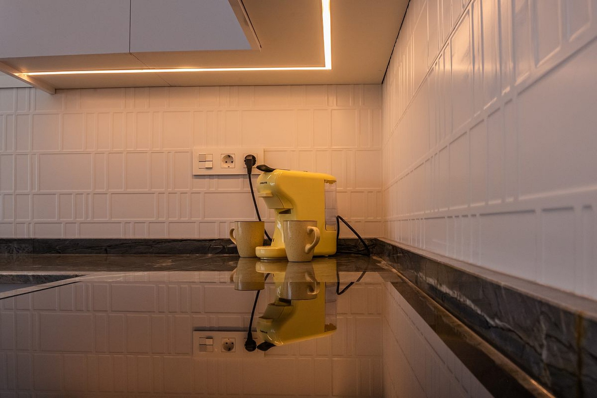 The kitchen is equipped with SIEMENS appliances and a wine cooler, while the fitted wardrobes in the bedrooms have LED lighting.