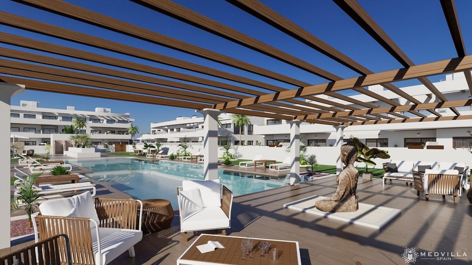 La Sunrise F3 - Apartment with terrace provided with 2 Bedrooms and 2 Bathrooms, communal swimming pool and parking space on own plot, located in Los Alcazares at the Costa Cálida (Murcia) in Spain.